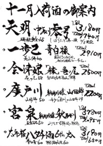 秋も深まってきております。味わい深い日本酒を夜長に楽しむ季節となってまいりました。早くも新酒の便りも来ております。気早に「しぼりたて」を楽しむも良し、しみじみと燗酒に酔いしれるも良しですね。